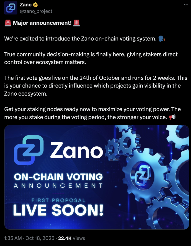 Introducing the Zano on-chain voting system https://blog.zano.org/introducing-on-chain-voting-system 2025-10-17 – Introducing the Zano On-Chain Voting systemDownload 🚨 Major announcement! 🚨We're excited to introduce the Zano on-chain voting system. 🗣️True community decision-making is finally here, giving stakers direct control over ecosystem matters.The first vote goes live on the 24th of October and runs for 2 weeks. This is your… pic.twitter.com/6AppLqAuyg— Zano (@zano_project) October 17, 2025