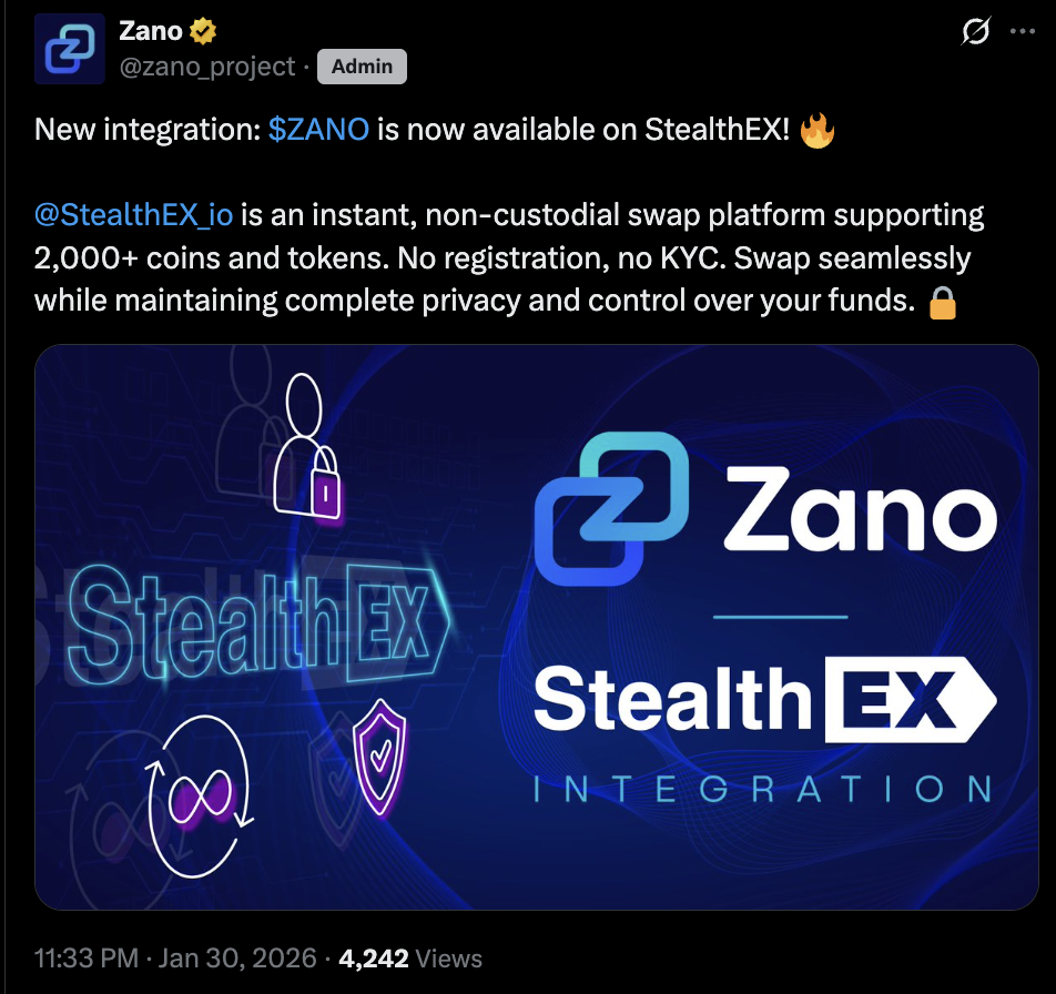 New integration: $ZANO is now available on StealthEX! 🔥@StealthEX_io is an instant, non-custodial swap platform supporting 2,000+ coins and tokens. No registration, no KYC. Swap seamlessly while maintaining complete privacy and control over your funds. 🔒 pic.twitter.com/yy65u9d5f9