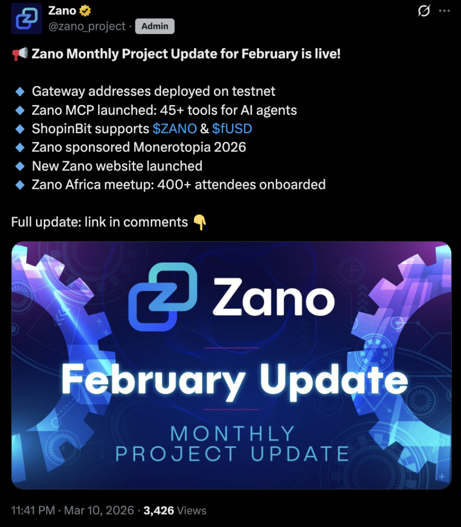 ZZano Monthly Project Update #17 – February 2026 https://blog.zano.org/zano-monthly-project-update-17-february-2026 2026-03-10 – Zano Monthly Project Update #17 – February 2026Download 📢 Zano Monthly Project Update for February is live!🔹 Gateway addresses deployed on testnet🔹 Zano MCP launched: 45+ tools for AI agents🔹 ShopinBit supports $ZANO & $fUSD🔹 Zano sponsored Monerotopia 2026🔹 New Zano website launched🔹 Zano Africa meetup: 400+ attendees… pic.twitter.com/sNOI1PEv7w— Zano (@zano_project) March 10, 2026